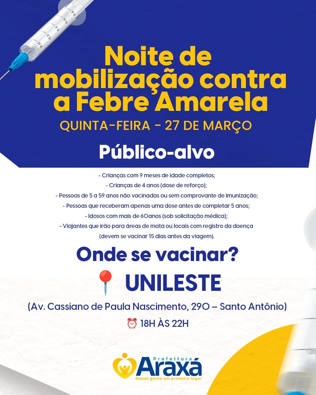 A mobilização integra as ações do Programa Mineiro de Imunização (PMI) em Araxá. A coordenadora de Imunização, Érica Fonseca, destaca que o horário estendido oferece uma oportunidade para a população se proteger contra a febre amarela. “Essa medida facilita o acesso à vacina, principalmente para aqueles que não podem comparecer durante o dia”, enfatiza.