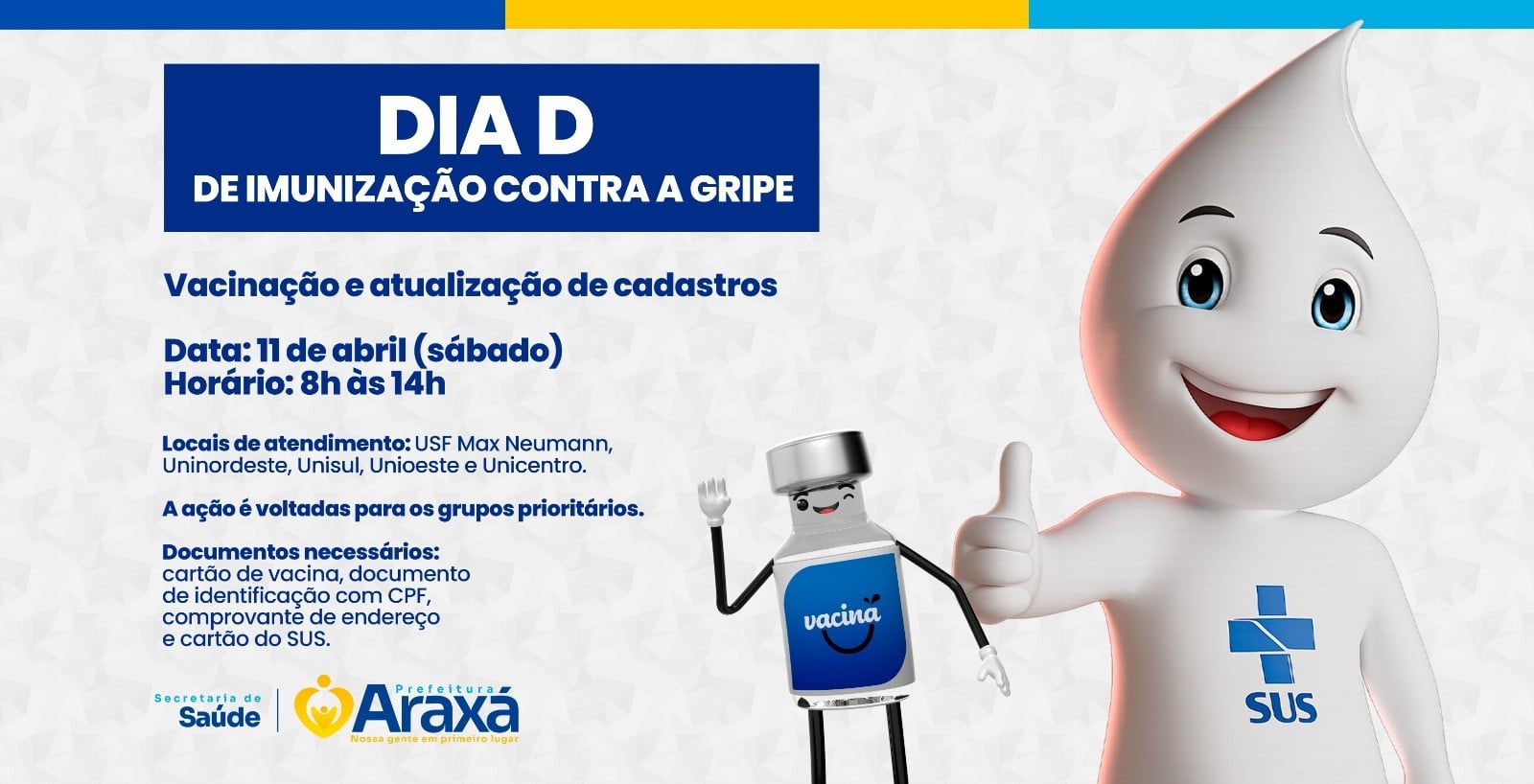 De acordo com a coordenadora de imunização de Araxá, Érica Fonseca, a mobilização tem o objetivo de ampliar o acesso à campanha. “O Dia D é uma oportunidade para que as pessoas que não conseguem ir até as unidades durante a semana possam se vacinar. O único imunizante disponível na ação será o contra a influenza, destinado a todos os públicos contemplados pela campanha, em todas as unidades participantes”, destaca.