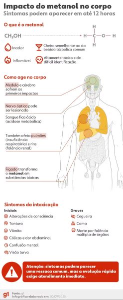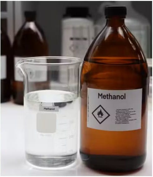 🔍 O metanol é um álcool usado industrialmente em solventes e outros produtos químicos, é altamente perigoso quando ingerido. Inicialmente, ataca o fígado, que o transforma em substâncias tóxicas que comprometem a medula, o cérebro e o nervo óptico, podendo causar cegueira, coma e até morte. Também pode provocar insuficiência pulmonar e renal.