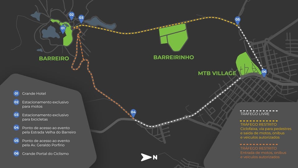 Táxis e carros de aplicativo: por meio do acesso pela estrada Velha do Barreiro, terão um local exclusivo para embarque e desembarque. Não será permitido que fiquem estacionados no complexo. Dentro da Mountain Bike Village, haverá um ponto de embarque e desembarque exclusivo para carros de APP.