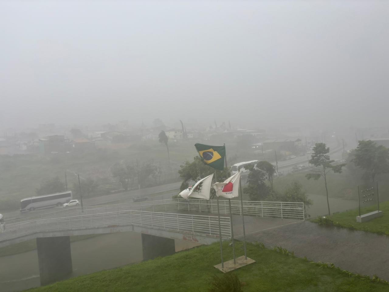 Mais cedo, uma forte chuva atingiu o município, com registro de 28 milímetros em cerca de 15 minutos, provocando quedas de árvores, queda de placa e pontos de alagamento momentâneo em diferentes regiões da cidade.