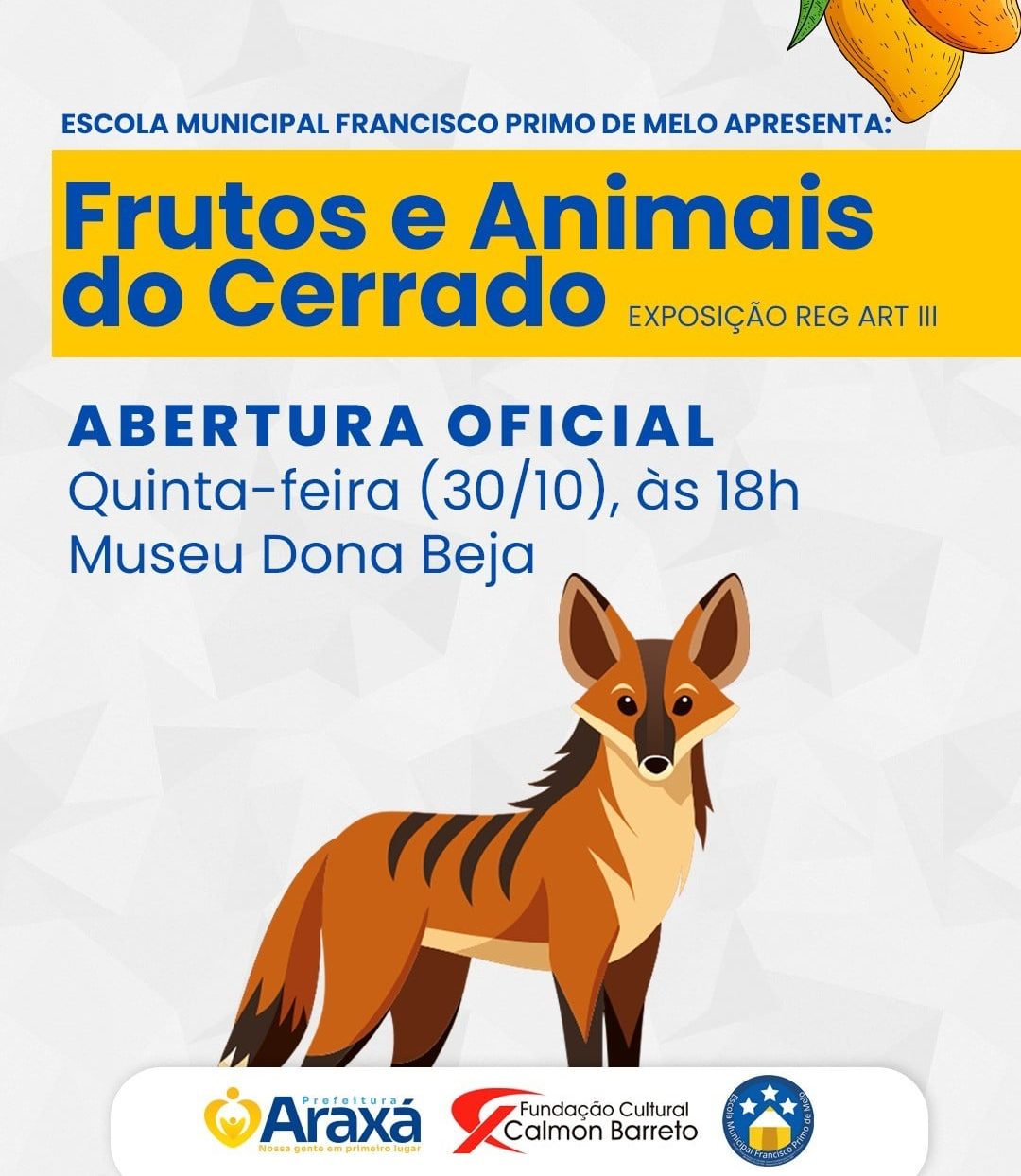 A Escola Municipal Francisco Primo de Melo inaugura nesta quinta-feira (30), às 18h, no Museu Dona Beja, a exposição “Reg-Art III: Frutos e Animais do Cerrado”, resultado do trabalho artístico das turmas do 4º e 7º anos. As obras ficarão em exposição até o dia 14 de novembro, com visitação de segunda a sexta-feira, das 12h às 18h, sábados, das 9h às 15h, e domingos e feriados, das 8h às 12h.
