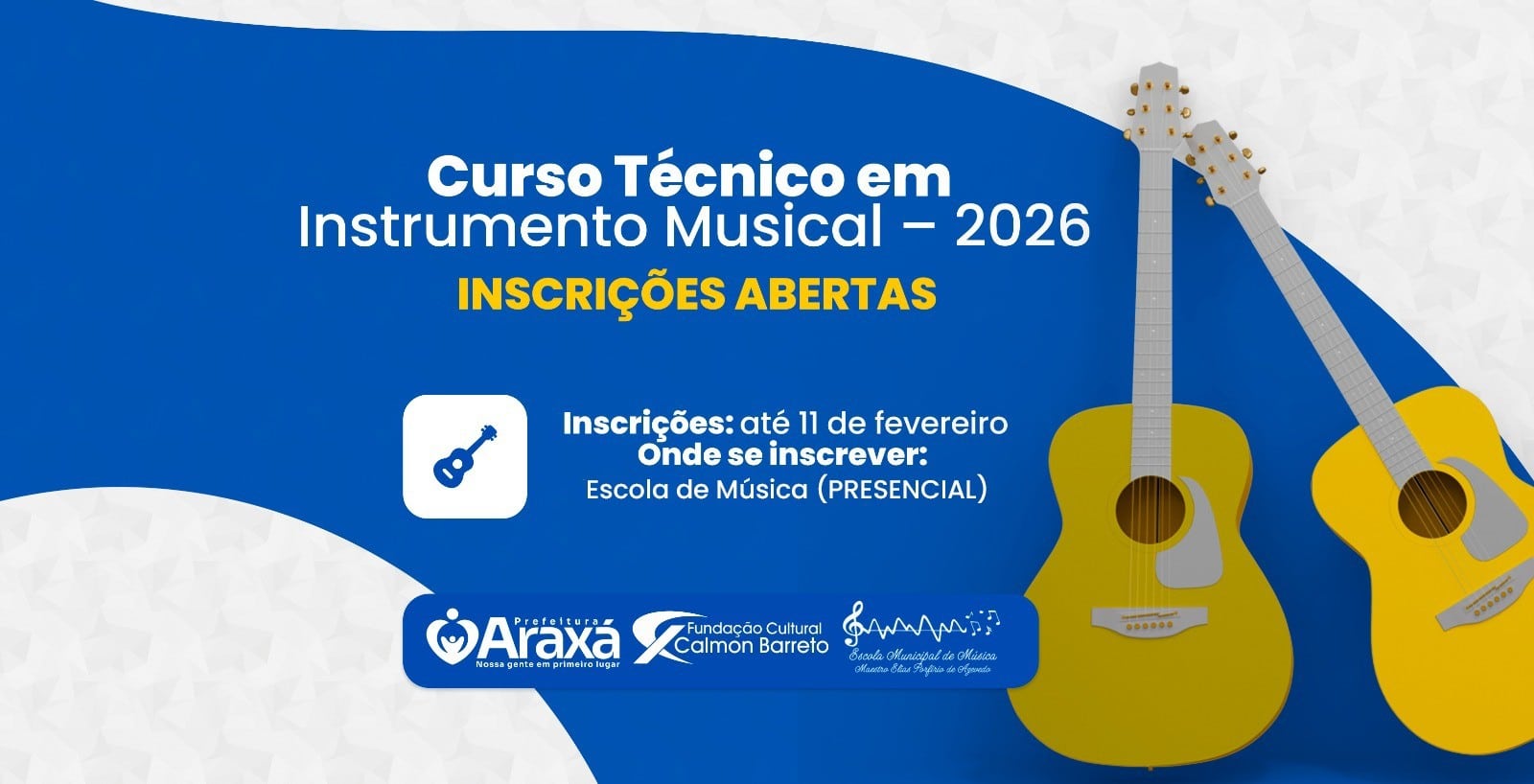 As inscrições devem ser realizadas presencialmente na sede da Escola Municipal de Música, localizada na Praça Arthur Bernardes, nº 18, Centro. O processo seletivo será composto por prova teórica, prova prática de habilidade específica e análise curricular, conforme critérios definidos em edital. As avaliações estão previstas para o dia 12 de fevereiro, na própria escola.