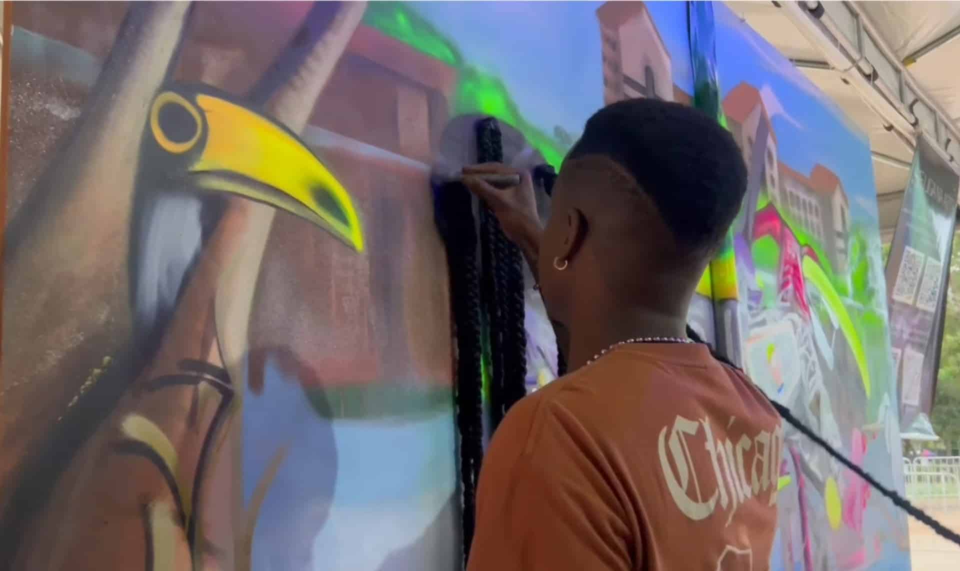 A arte e identidade local também estão presentes. O artista Matheus Black está criando ao vivo um painel em grafite, que traz cor e expressão urbana, com representações sobre o Complexo do Barreiro, bicicleta e identidade pessoal.