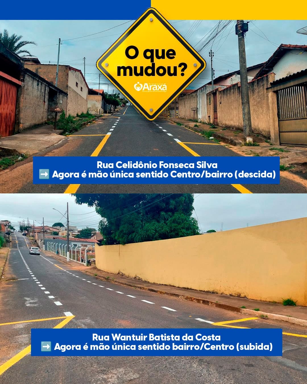 Foi realizada a sinalização, e a Rua Wantuir Batista da Costa passou a ser mão única no sentido bairro/Centro (subida). Já a Rua Celidônio Fonseca Silva tornou-se mão única no sentido Centro/bairro (descida). A alteração tem como objetivo melhorar a fluidez do trânsito na região e garantir mais segurança aos moradores e usuários das duas vias.